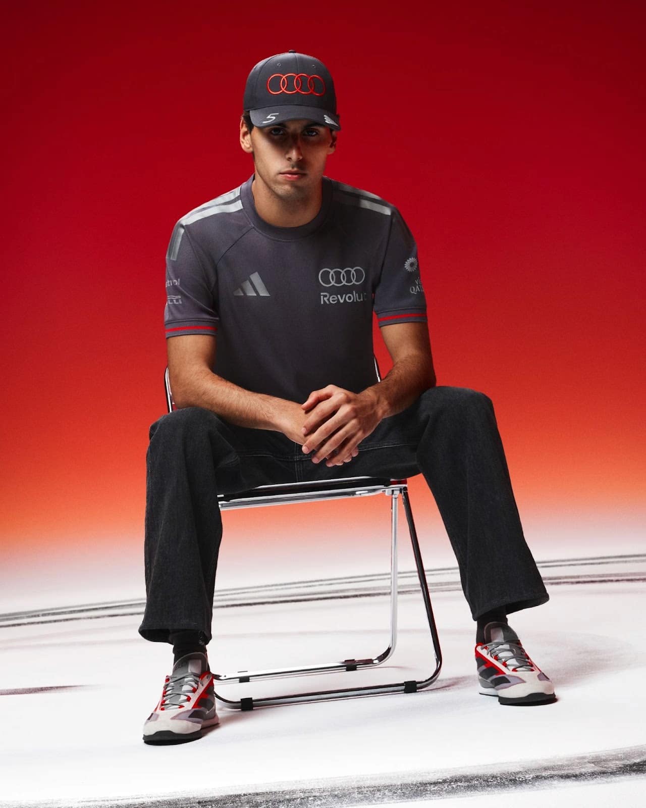 O design adota detalhes em vermelho como elemento visual de integração, em referência à performance e à funcionalidade do carro da Audi Revolut Formula 1 Team. A paleta em tons de cinza, inspirada no titânio presente no veículo, orienta a construção das silhuetas, que priorizam linhas minimalistas, estética sóbria e aplicação discreta de marca.