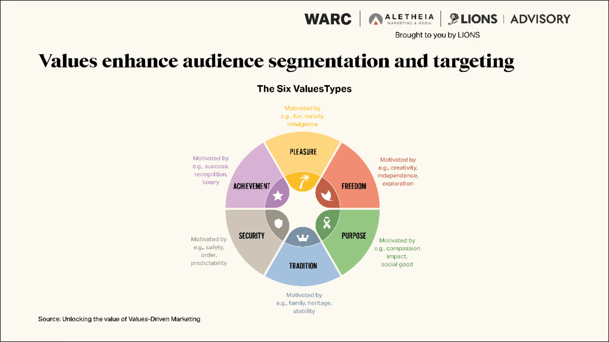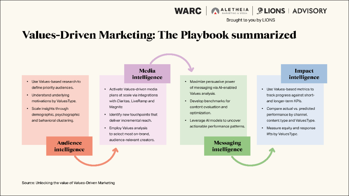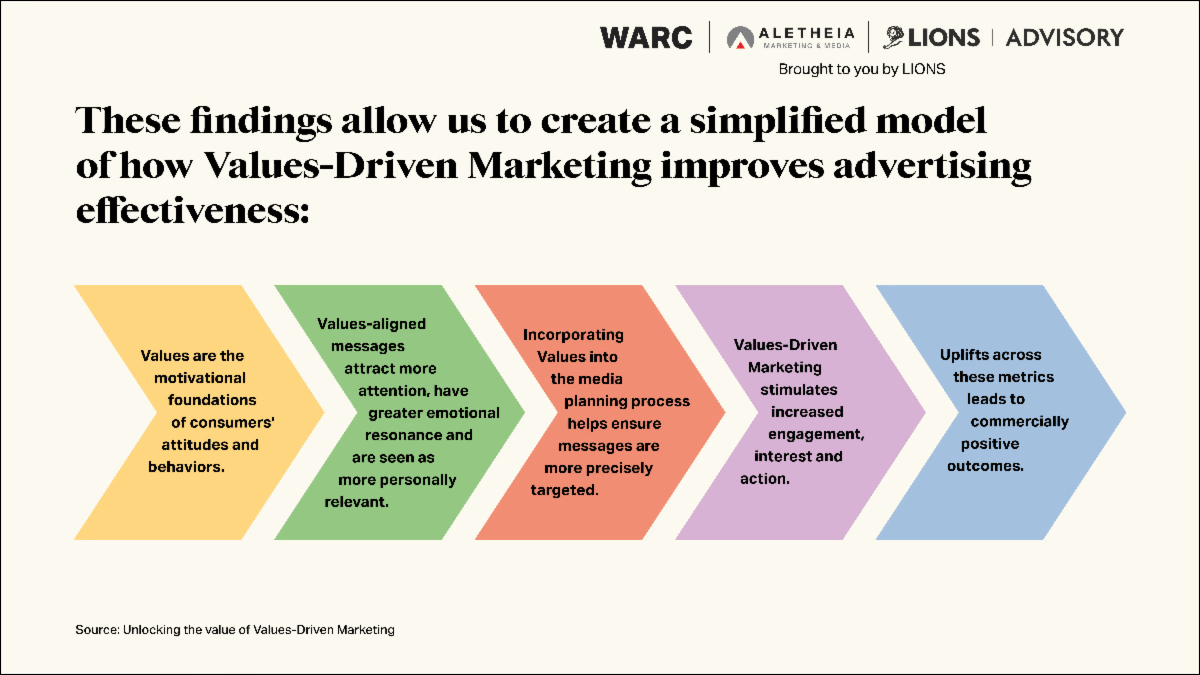 Segundo a da WARC, que realizou a pesquisa em parceria com a Aletheia Marketing and Media e com o apoio da LIONS Advisory, as evidências refletem como uma abordagem baseada em valores pode ser aplicada no mundo real, com impacto direto em públicos, canais, mensagens e mensuração.