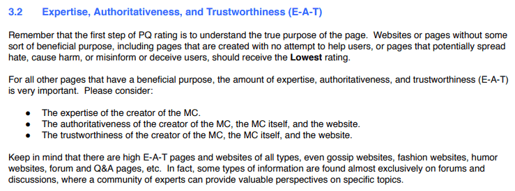 Esse documento mostra as diretrizes do algoritmo para as pessoas que avaliam manualmente a qualidade dos resultados que o buscador oferece. O E-A-T aparece assim nesse documento: